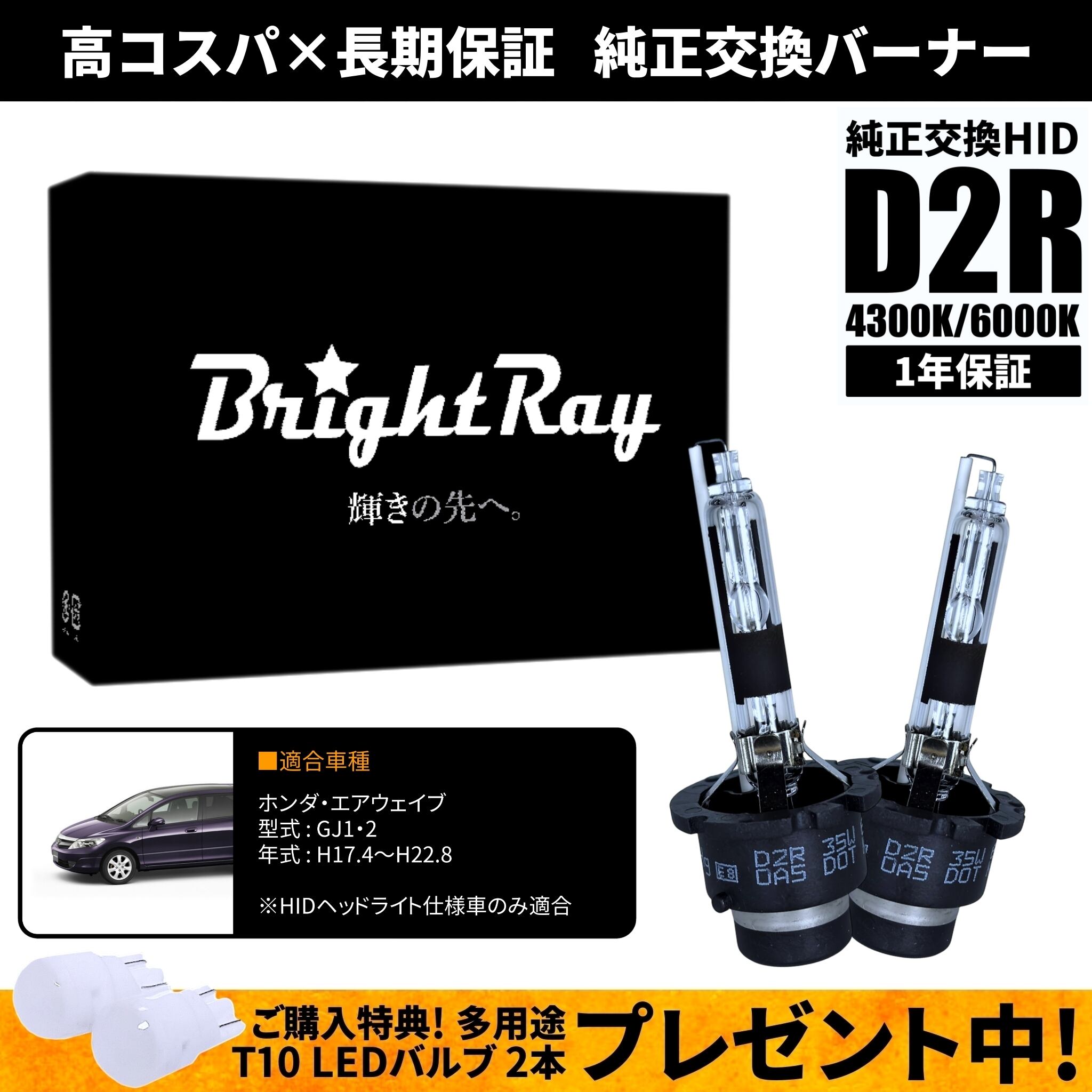BrightRay D2R HIDバルブ 1年保証 ホンダ エアウェイブ GJ1 GJ2 車検対応 純正交換 バーナー 4300K 6000K ヘッドライト