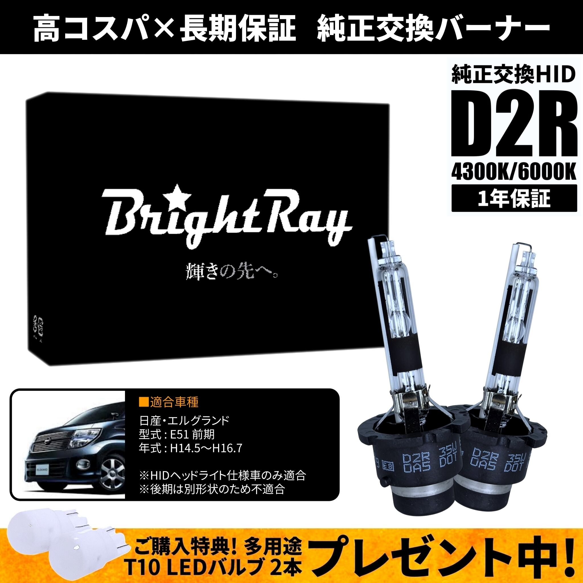 BrightRay D2R HIDバルブ 1年保証 日産 エルグランド E51 前期 車検対応 純正交換 バーナー 4300K 6000K ヘッドライト