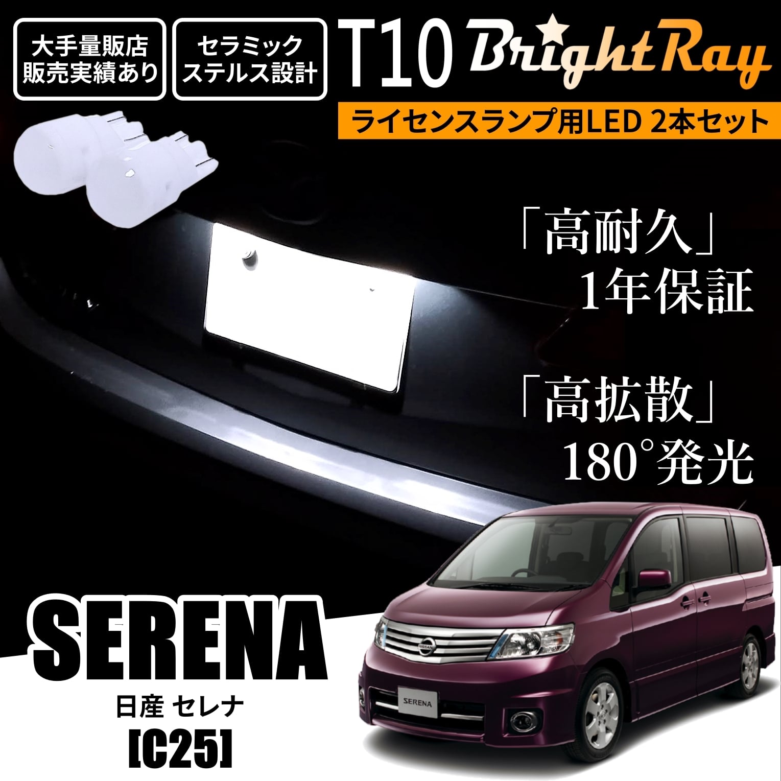 送料無料 日産 セレナ C25 BrightRay T10 LED バルブ 1年保証 ナンバー灯 ライセンスランプ ウェッジ球 ホワイト